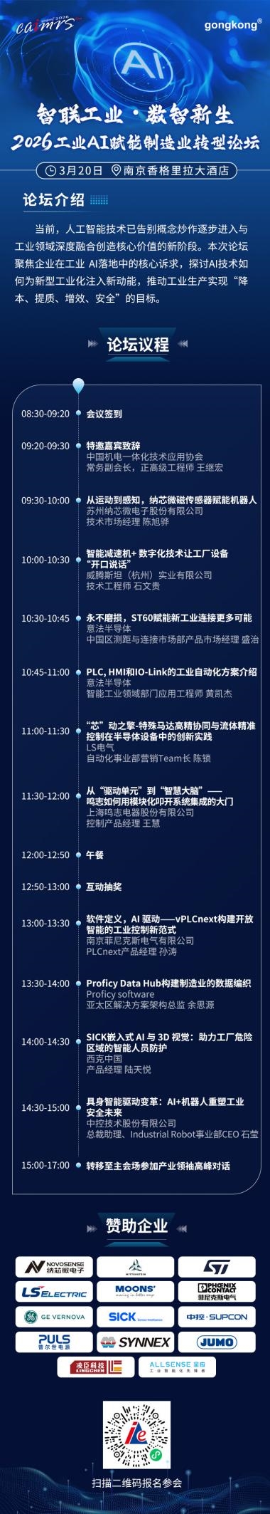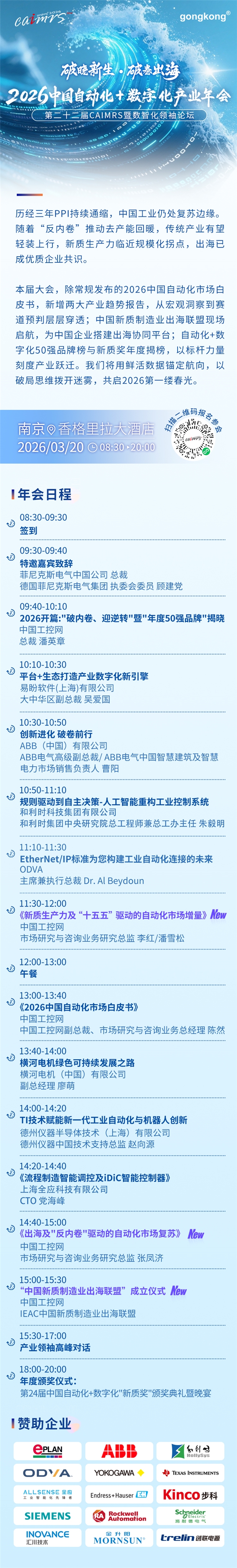 工业的冻土之下,新质生产力的根系正在悄然生长,谁将成为真正的破晓者?2026年3月20日,以“破晓新生 破卷出海”为主题的2026中国自动化+数字化产业年会暨第二十二届CAIMRS数智化领袖论坛将在南京香格里拉大酒店隆重举行。本次大会由中国工控网、国潮智造社联合主办,并获得中国机电一体化技术应用协会、中国信息通信研究院工业安全中心的大力支持,旨在集结工业领域的全球领军者、实干家与思想者,共执“新质之火”,照亮产业复苏的一缕春光。